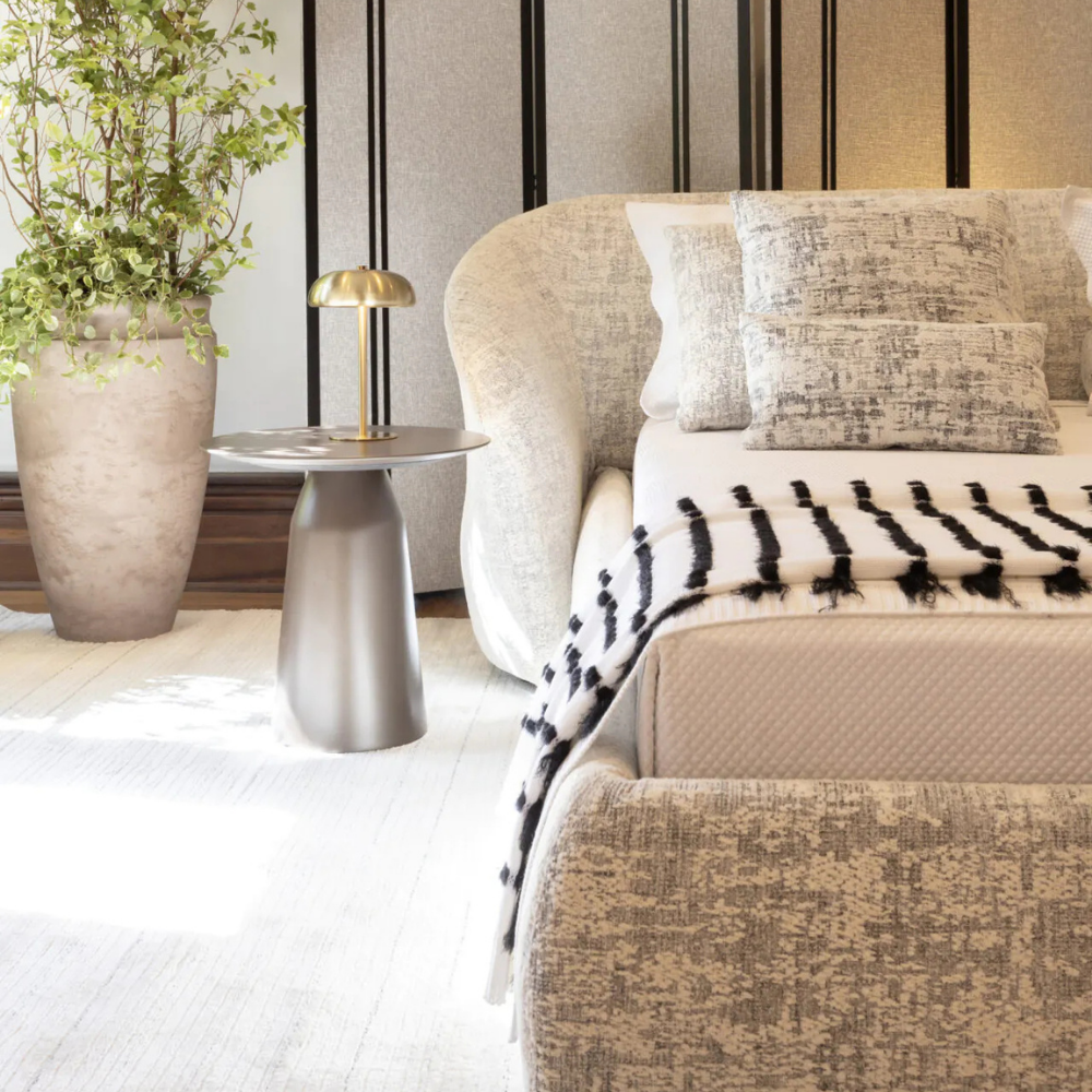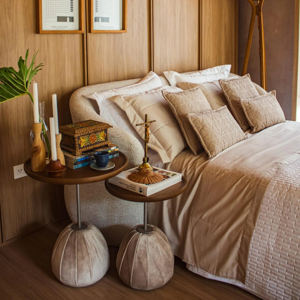 A Cama Catalunia é o elemento central que eleva a experiência de descanso a outro nível. Com um design sofisticado e funcional, ela se destaca pela cabeceira acolchoada e linhas suaves que complementam a estética do espaço, pensado por Eduardo Baldelomar para a Casacor Bolívia.