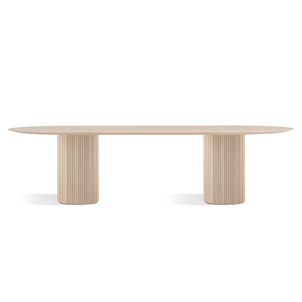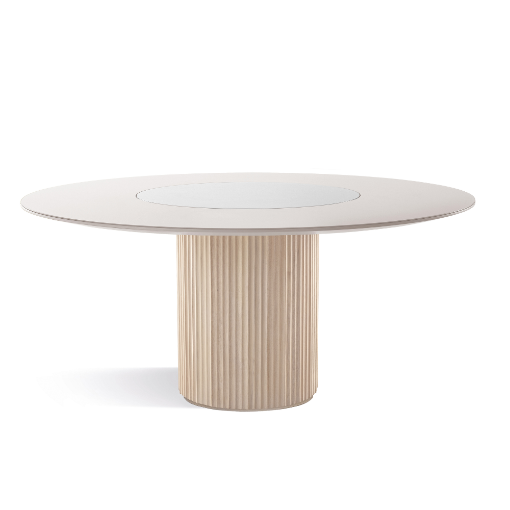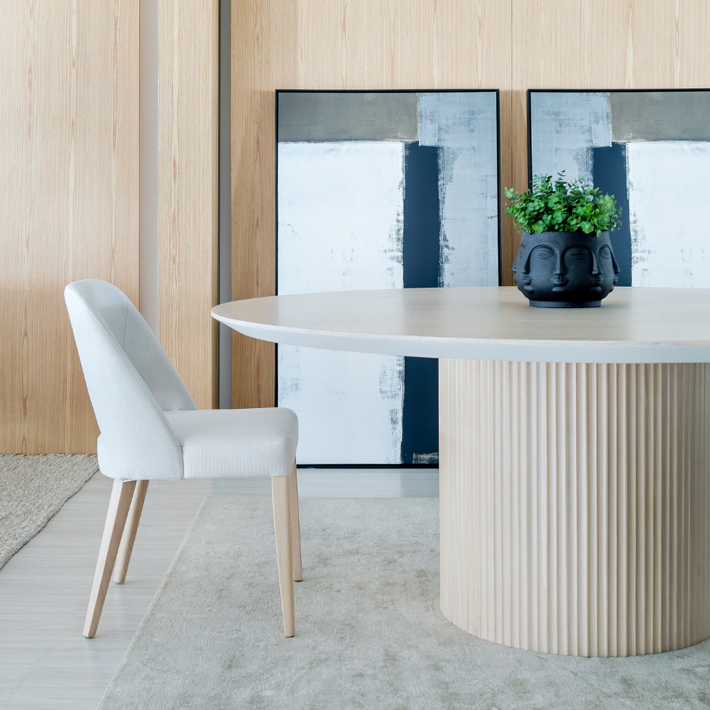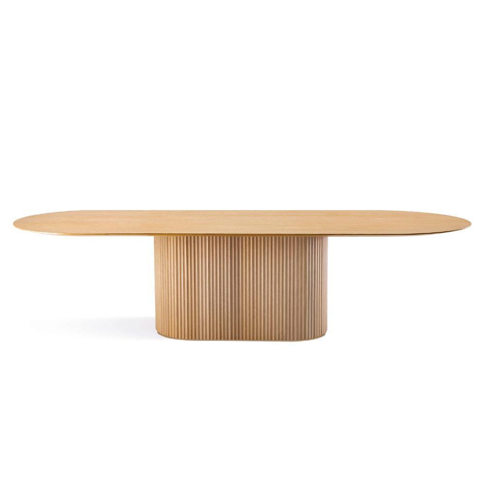 A mesa Atenas une beleza e sofisticação em uma só peça. Com a base ripada, ela pode ter o tampo redondo ou oblongo, o oblongo tendo duas opções de base.