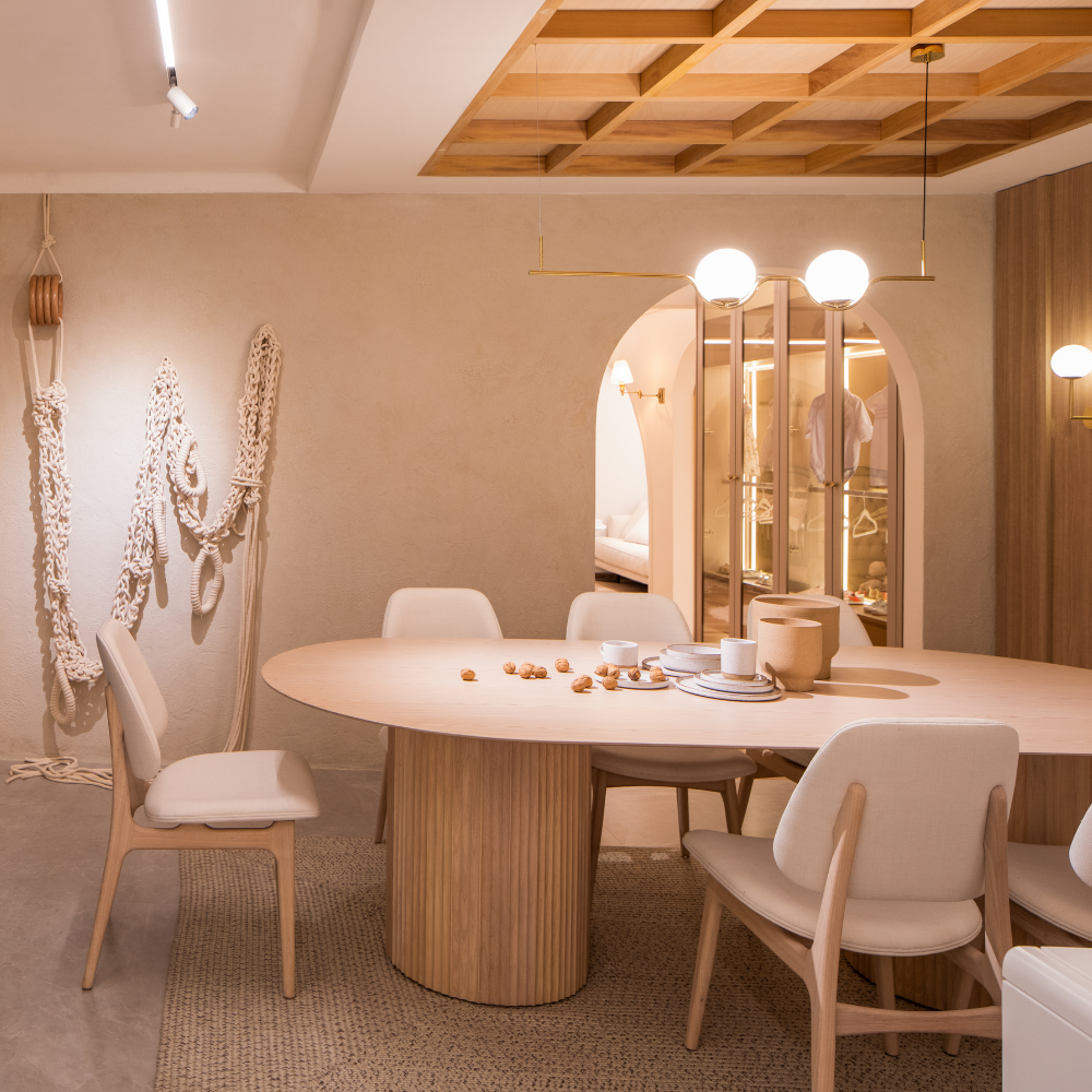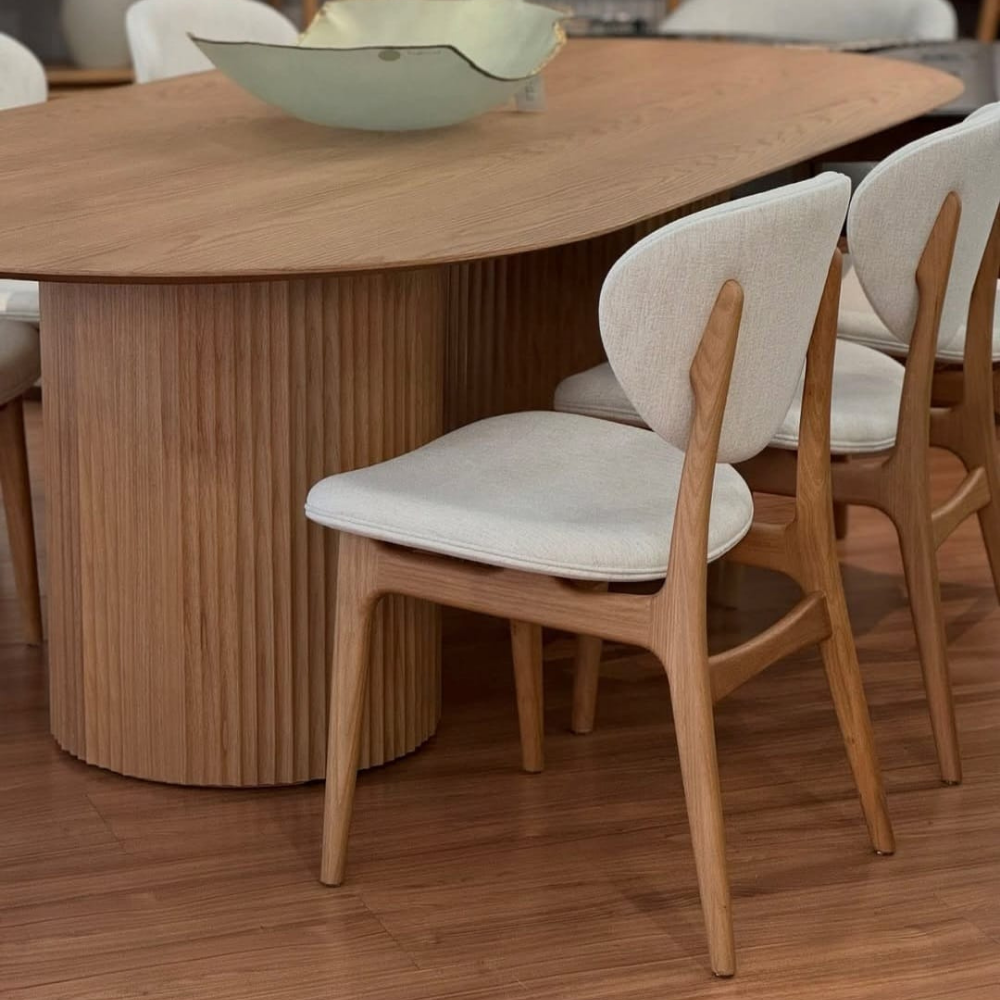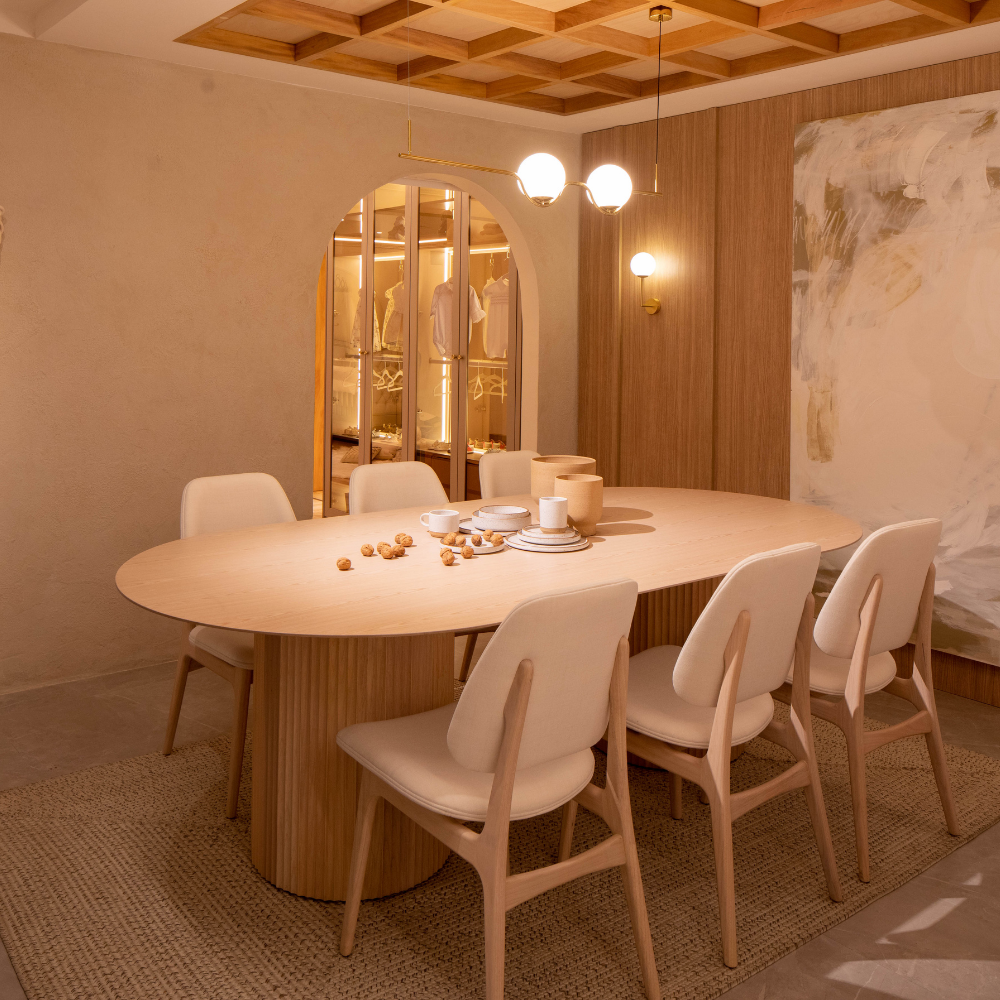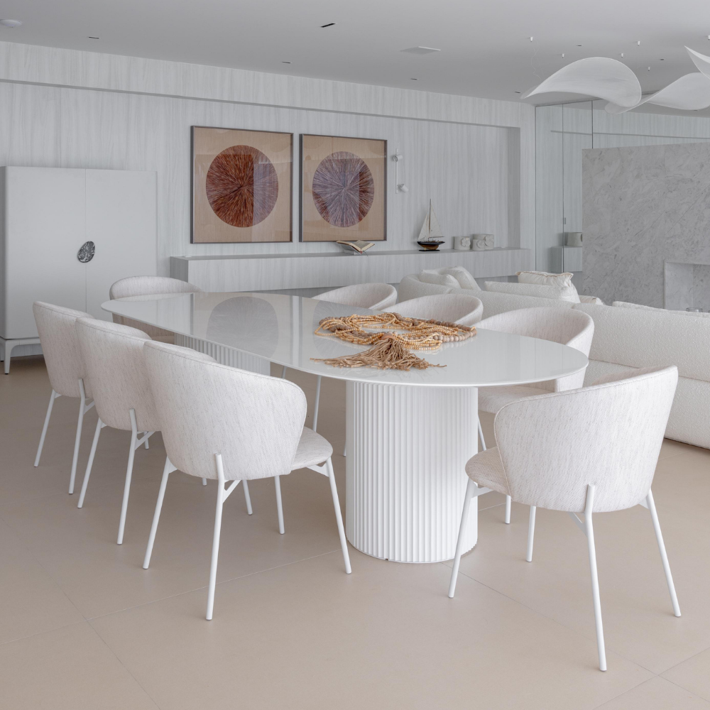 A mesa Atenas une beleza e sofisticação em uma só peça. Com a base ripada, ela pode ter o tampo redondo ou oblongo, o oblongo tendo duas opções de base.